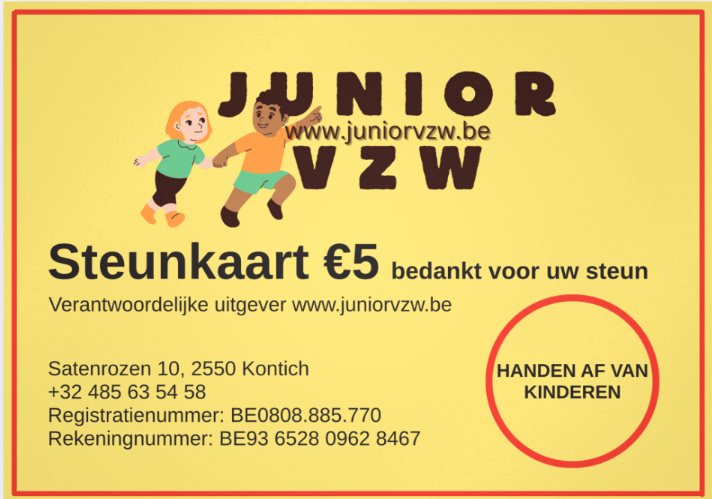 Of wil je steunend lid worden van Junior vzw? Voor €30 ontvang je een koffiemok of drinkfles met ons logo. Bezorg ons je naam, adres, telefoonnummer zodat we jouw attentie kunnen opsturen!